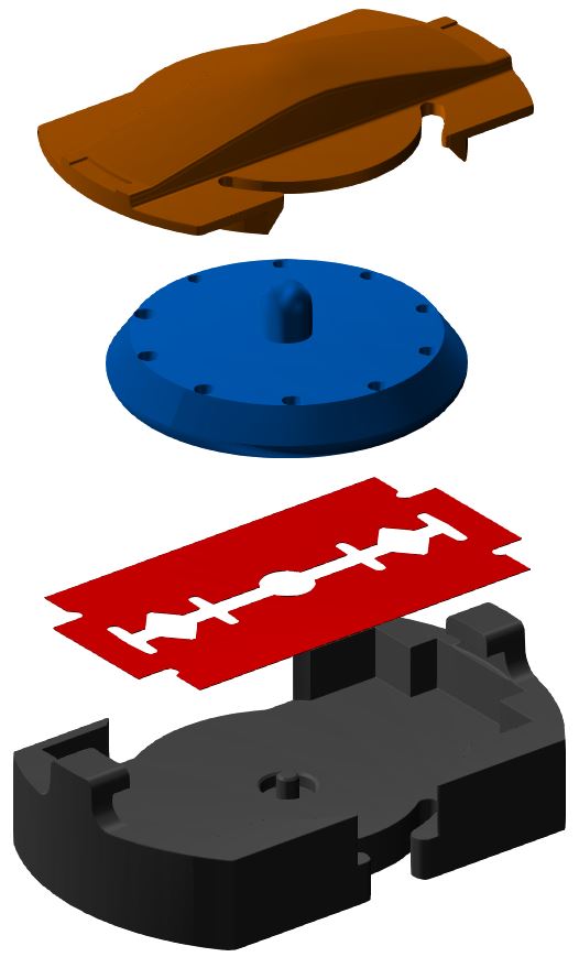 Montieren Sie das Basisteil, die Rasierklinge, die Tip Snip-Scheibe und die Abdeckung in dieser Reihenfolge (wie im Bild gezeigt).