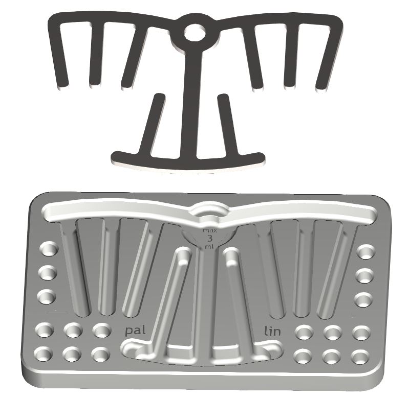 – Auch die Anordnung der Greifposition ist für alle Rillen gleich ausgerichtet und das Greifen der Papier-/ Guttapercha-Spitzen ist durch Stützstreben unter diesen für das Handling mit der Pinzette optimiert.
