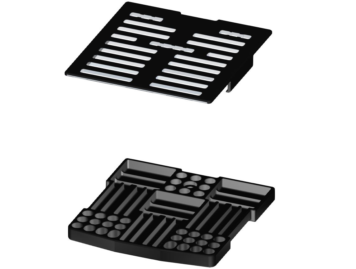 Wahlweise mit Deckel. Damit können vereinzeltes Kleinmaterialien (Papier-spitzen, Watte-, Schaumstoff-Pellets, Teflonband und (hochkant eingesteckte) Silikonstopper in ihrer Position gehalten und mitsterilisiert werden.