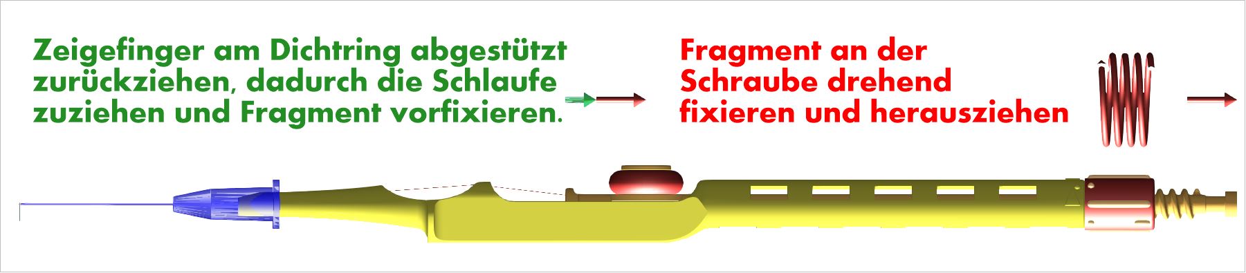 Im Laufe der Fragmententfernung kann die Spannung der Drahtschaufe am Fragment am frei liegenden Draht (im Bereich der Mulde) drückend oder zupfend wie an einer Gitarren-Saite geprüft und durch verstellen der Schraube am hinteren Ende des Griffs angepasst werden. Eine Umdrehung der Schraubhülse entspricht 2 mm und lässt sich durch Marken alle 1/8-Drehung auch durch die Assistenz sehr genau dosieren.