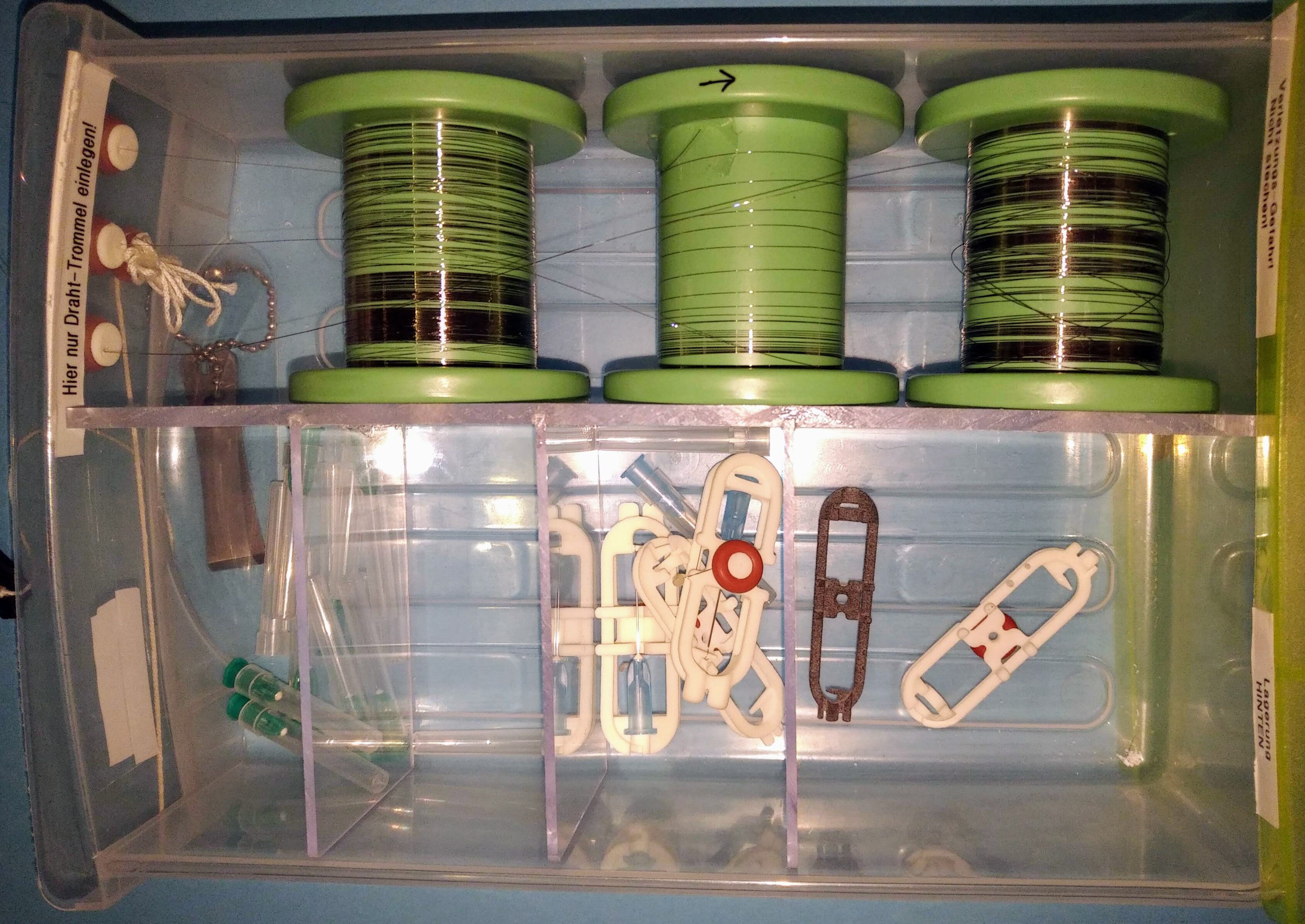 0,09 mm im Set, 0,1 mm & 0,15 mm Durchmesser auf 20 m Trommel (im Bild: Fädler-Station nach Csögör mit 3 Drahttrommel und Aufbewahrungsfä-chern für Kanülen-Drahschlaufen-Halter, Kanülen, Längenmaß, Montagestand, Draht-Bolzenschneider ff.