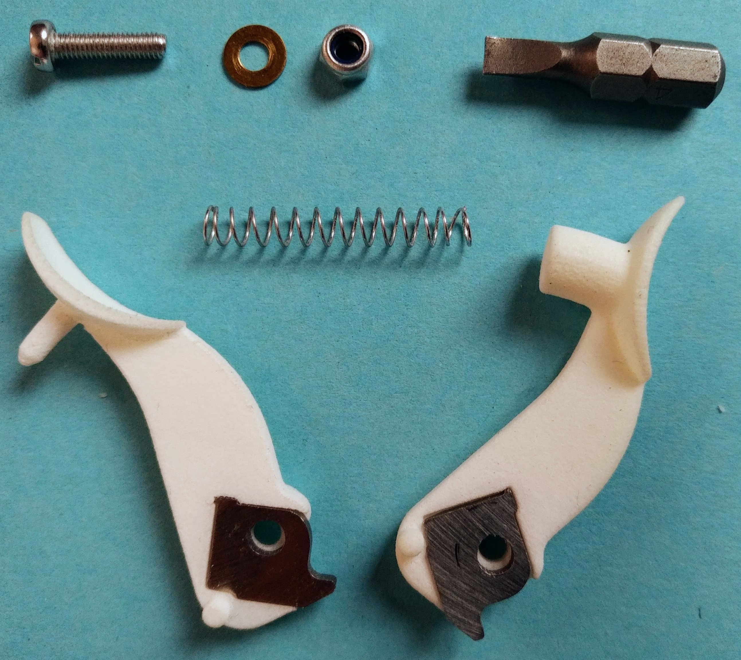 DIY ! – Vier der sieben Komponenten sind jeweils paarweise miteinander verbunden. Die Verbindungsstellen bitte lösen, abschneiden und versäubern. 3D-Druck-bedingte scharfen Kanten leicht schmirgeln. Für den ersten Zusammenbau Schutzhandschuhe tragen, um sich nicht an noch scharfen Kanten zu verletzen, da Anfangs die starke Klemmpassung nach und nach eingeschliffen werden muss.