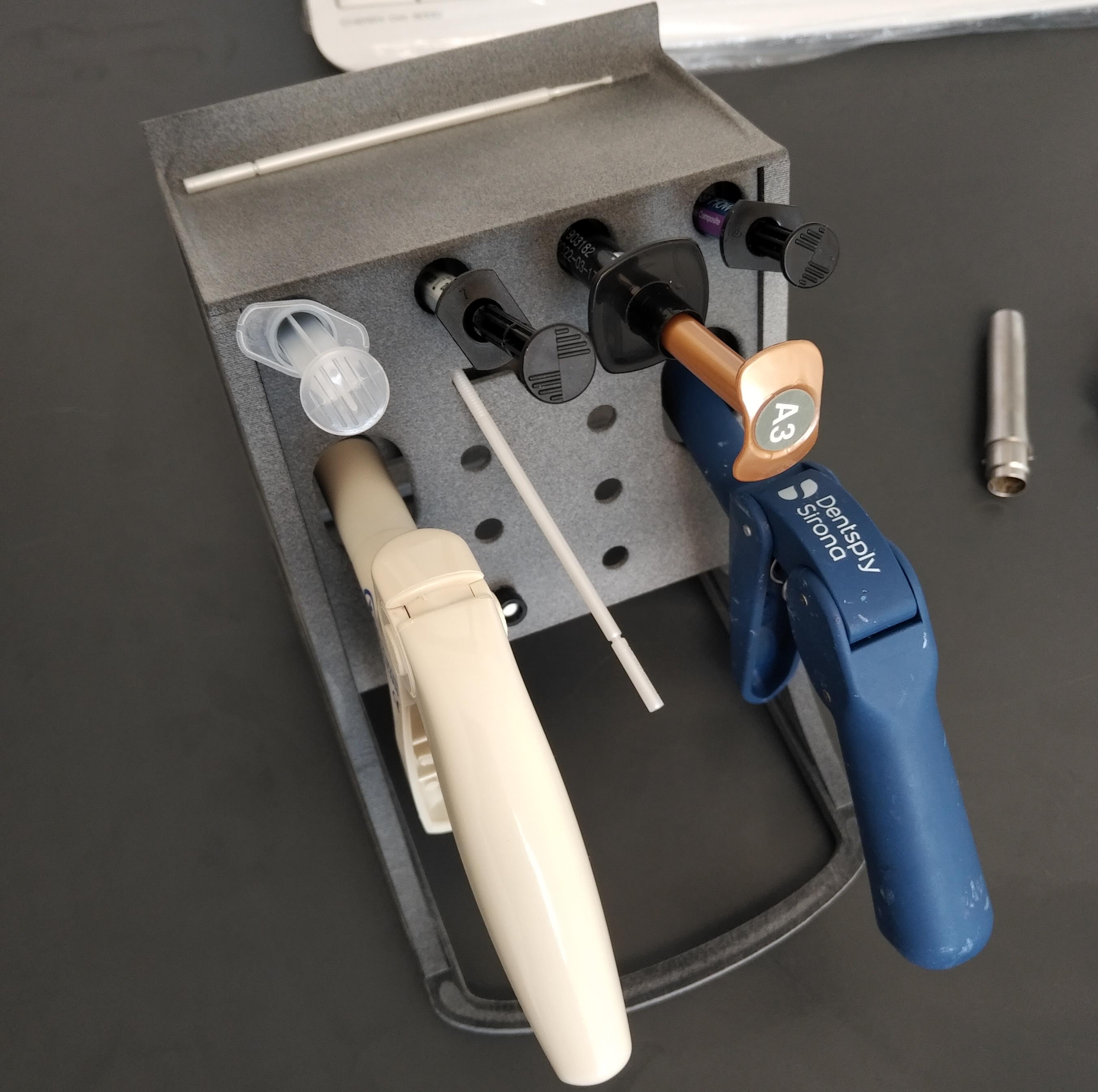 Lange und kurze Applikationstips, Ätzgel, Bonding-Primer und -Adhäsive, Zemente, divese Composit-Baseliner/ Flow-Spritzen/ -Cavifils/ Ceram-Kapsel und Applikator-pistolen folgender: Bauart können lichtgeschützt, platzsparend, handlich und alles mit einem Handgriff auf den Behandlungstray gestellt und wieder weggeräumt werden.