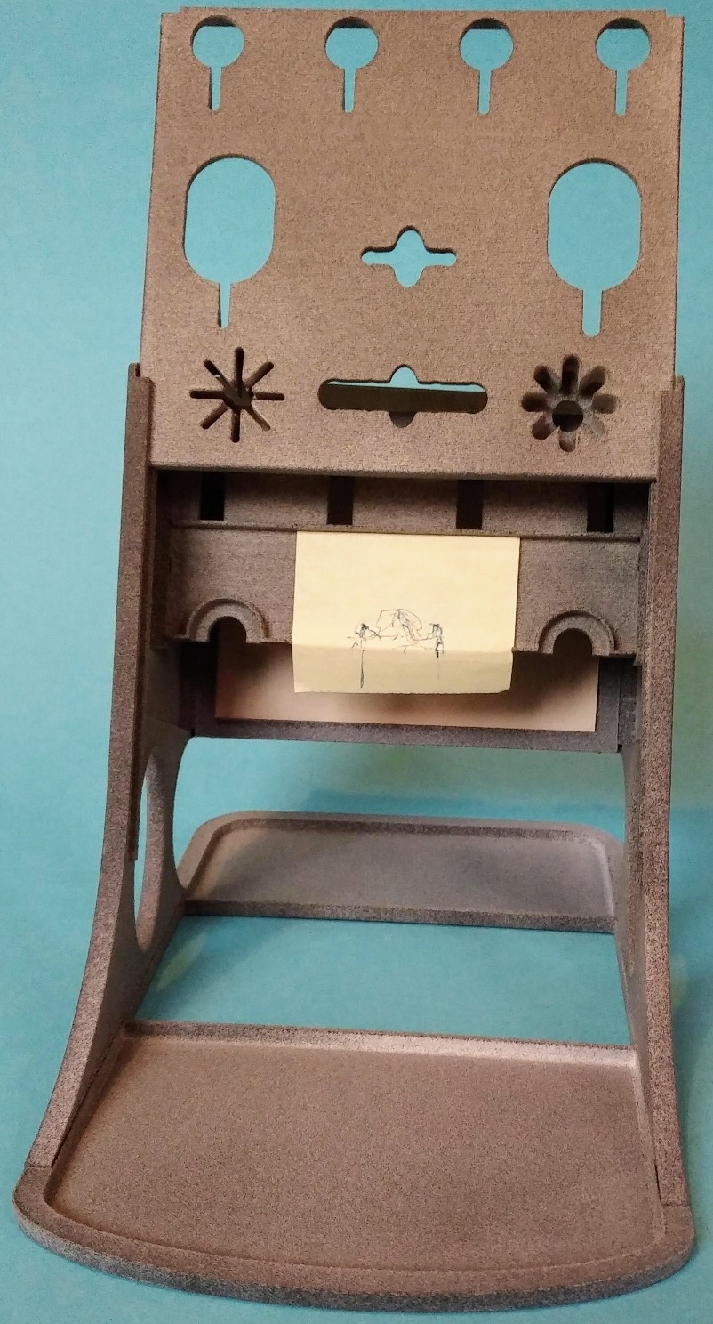 – 50 x 35 mm, innen auf die mittlere Platte von unten einzuschiebendes und nach hinten abzuknickendes Baltt. (oder 50 x 40 mm Post-It-Haftnotizblätter)